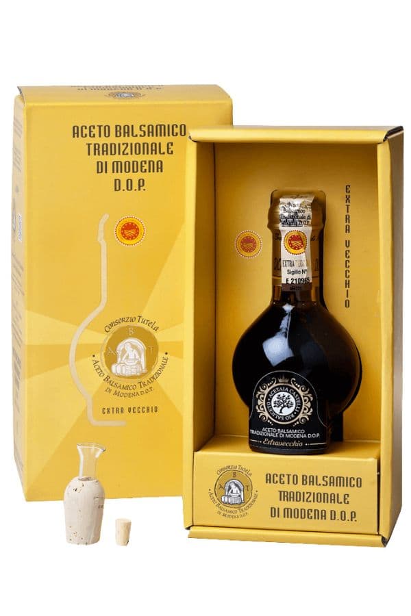 This Traditional Balsamic Vinegar of Modena DOP, “Extra Aged” quality, is the result of a long aging process in barrels made from various types of wood. It offers a dense texture, complex aromas and a deep, persistent flavor. Perfect for drizzling raw over refined dishes such as aged cheeses, strawberries, risottos, or vanilla ice cream.